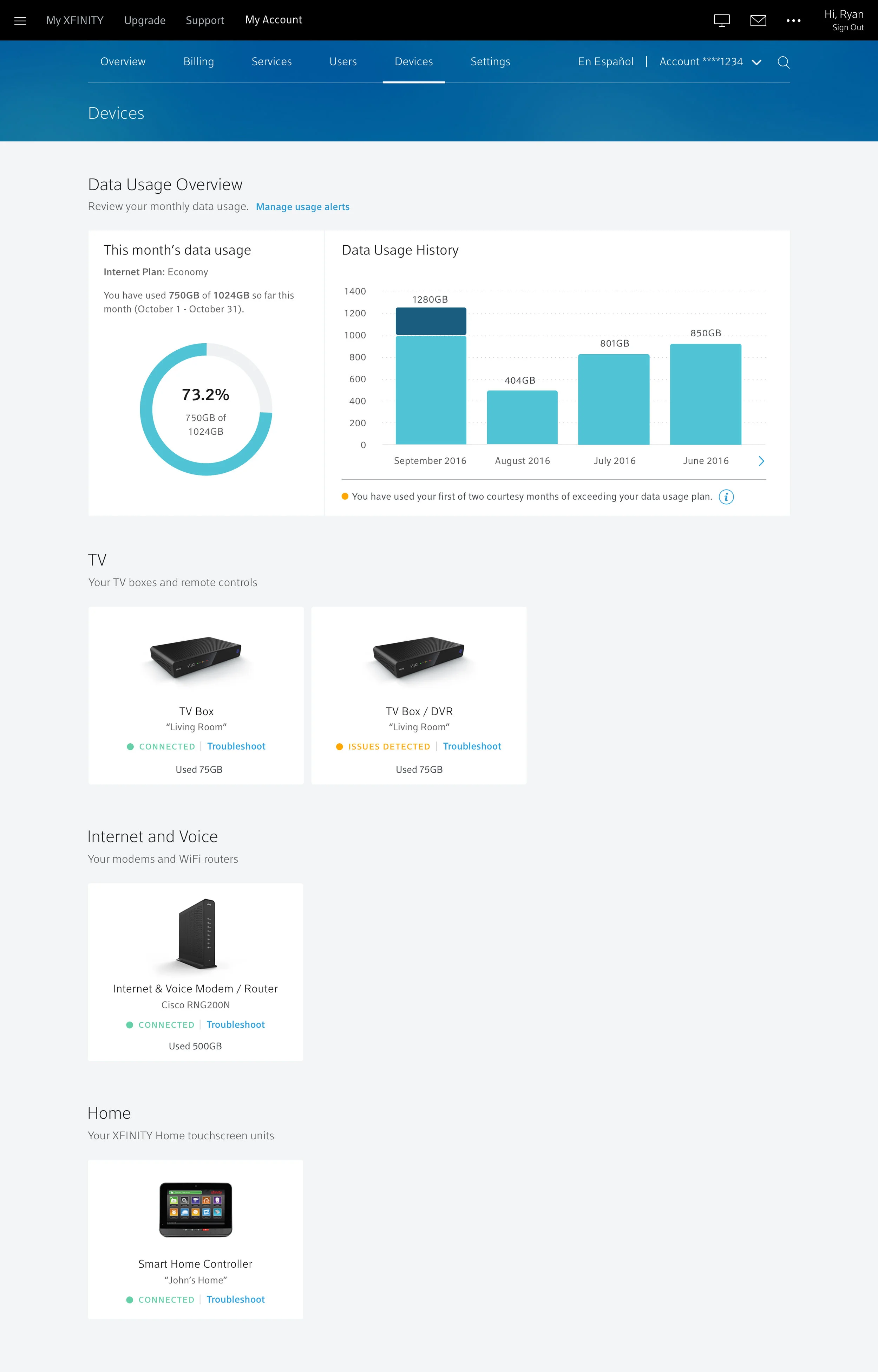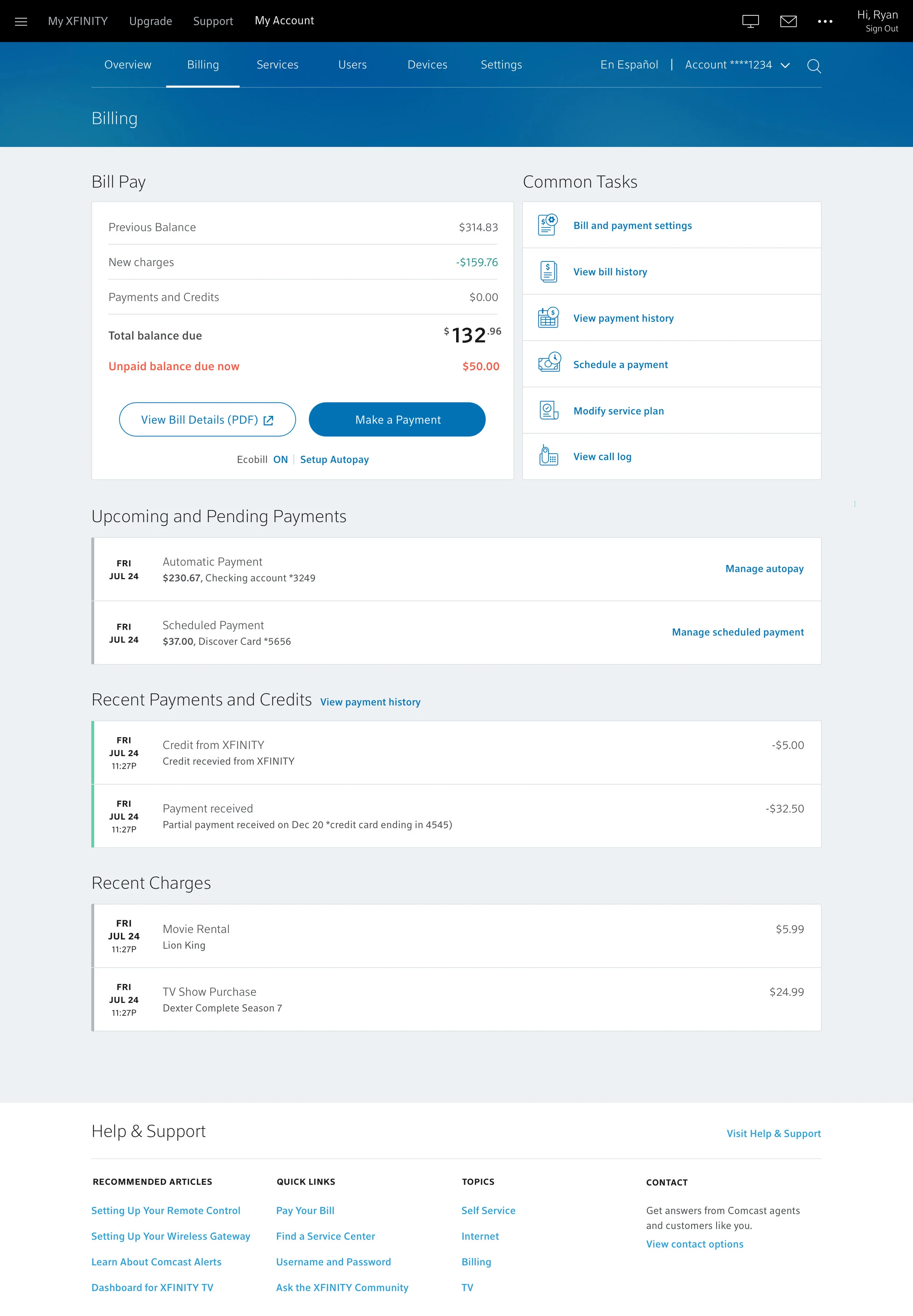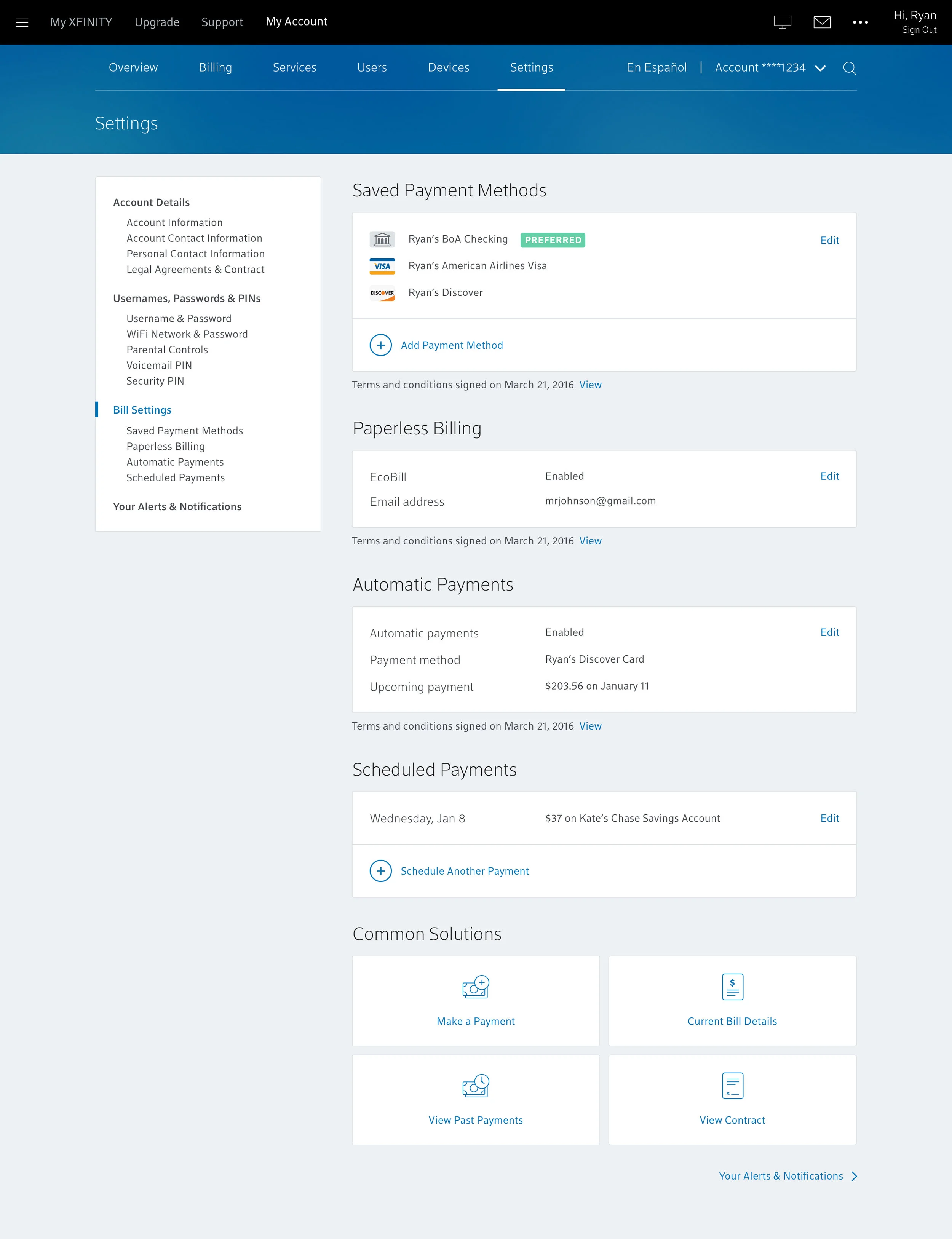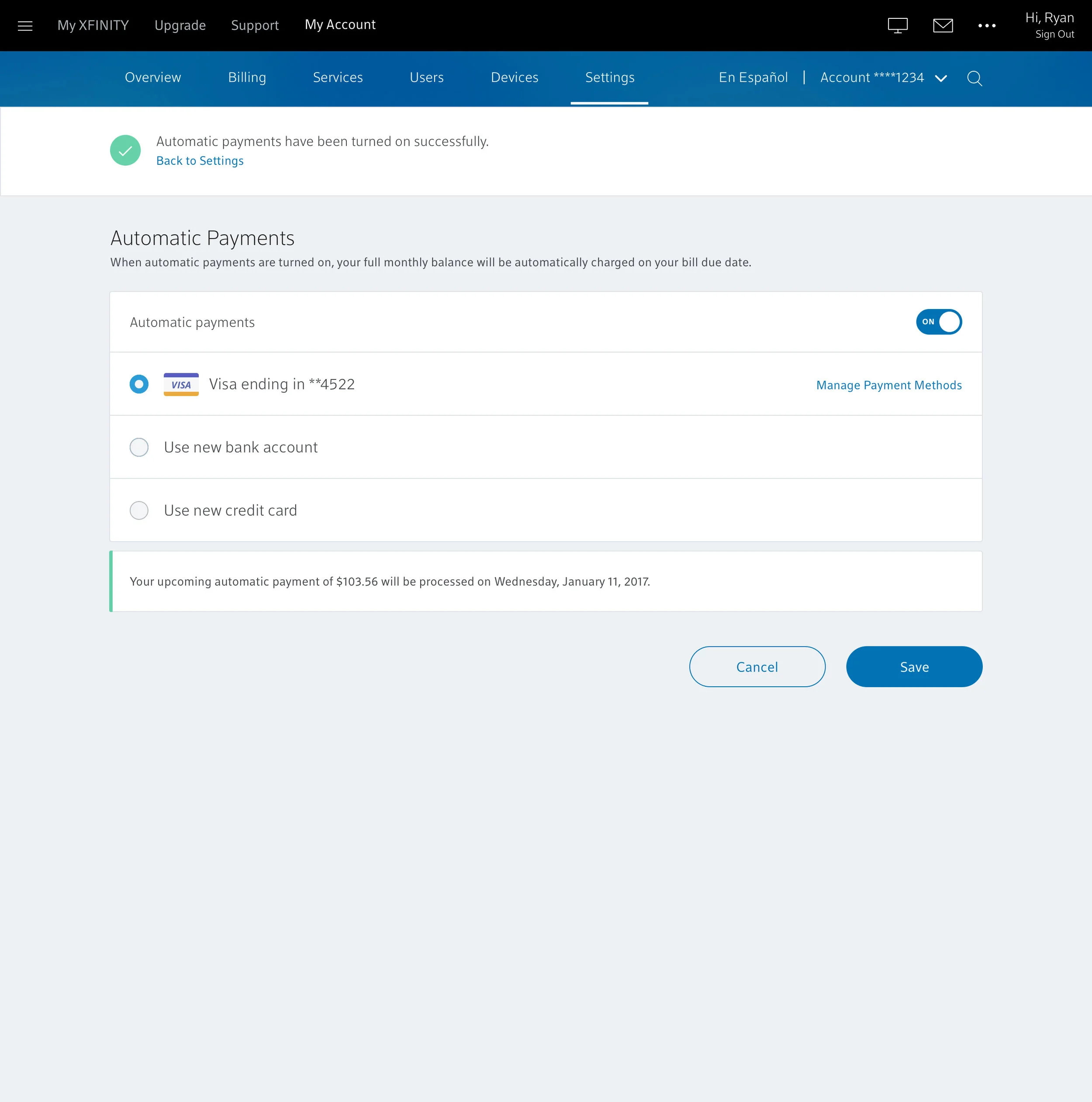 Establish XFINITY My Account as the go-to place for all customer transactions while addressing top customer pain points. Surface features to better enable frictionless transactions across the customer lifecycle. Fully responsive. Meets WCAG 2.0 AA guidelines for accessibility.